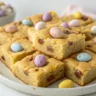Second, press about two thirds of the Mini Eggs into the batter before baking, then scatter the rest on top immediately when they come out of the oven. This gives you both melty pockets inside and that irresistible candy crunch on the surface. Third, let them cool completely in the pan before cutting. I know it’s agony when your kitchen smells like vanilla and melted chocolate, but cutting warm blondies means crumbly disappointment instead of clean slices.