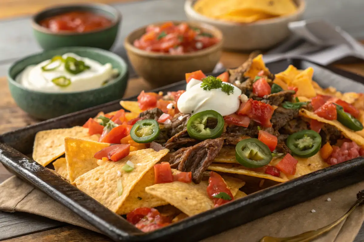 Add a layer of seasoned ground beef or shredded chicken before the cheese for heartier nachos. My loaded nachos with ground beef recipe has a killer spice blend you can borrow – just brown one pound of meat with those seasonings and scatter it evenly across the chips.